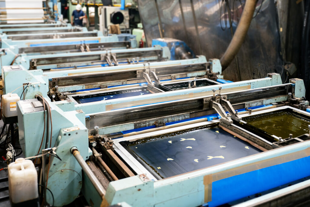 フラットスクリーンを用いて最大8色までの多色刷りを実現。厚手から薄手まで対応し、ナイロン生地への加工も高い評価を受けています。
