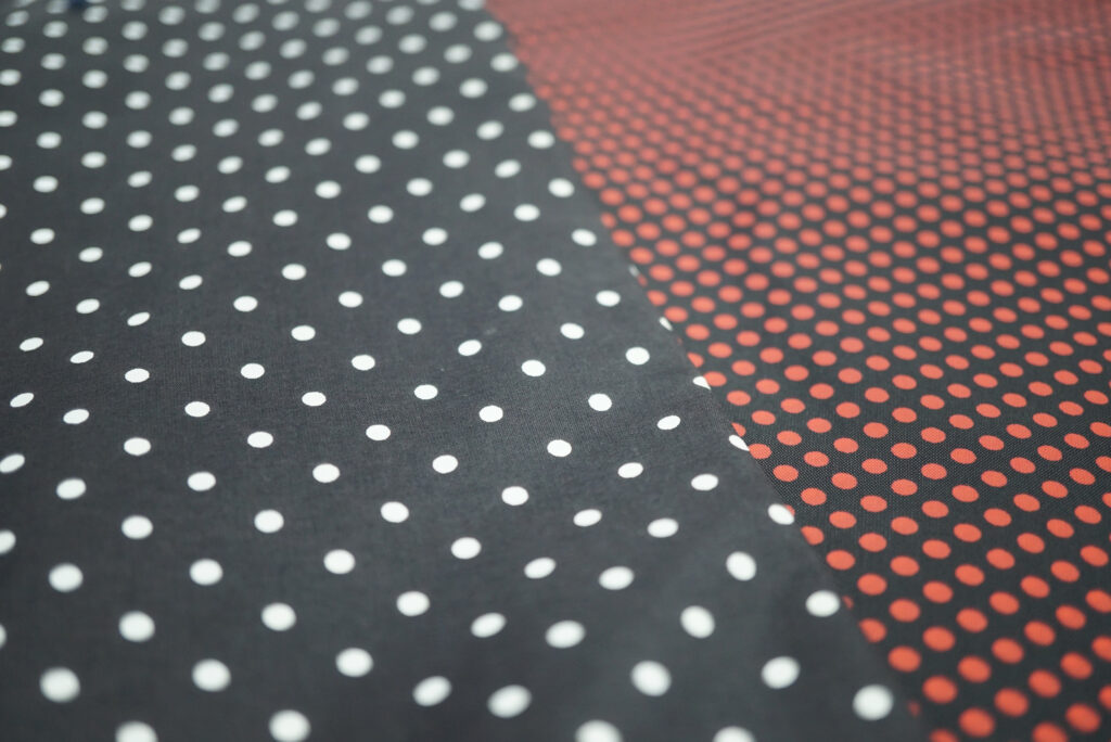 円筒形の型を回転させて、継ぎ目のない連続模様をプリントする技法です。水玉やストライプなど、ジョイントの取れない柄、連続性のある柄のデザインに対応でき、フラットスクリーンに比べて加工スピードが早いことも特徴の1つです。