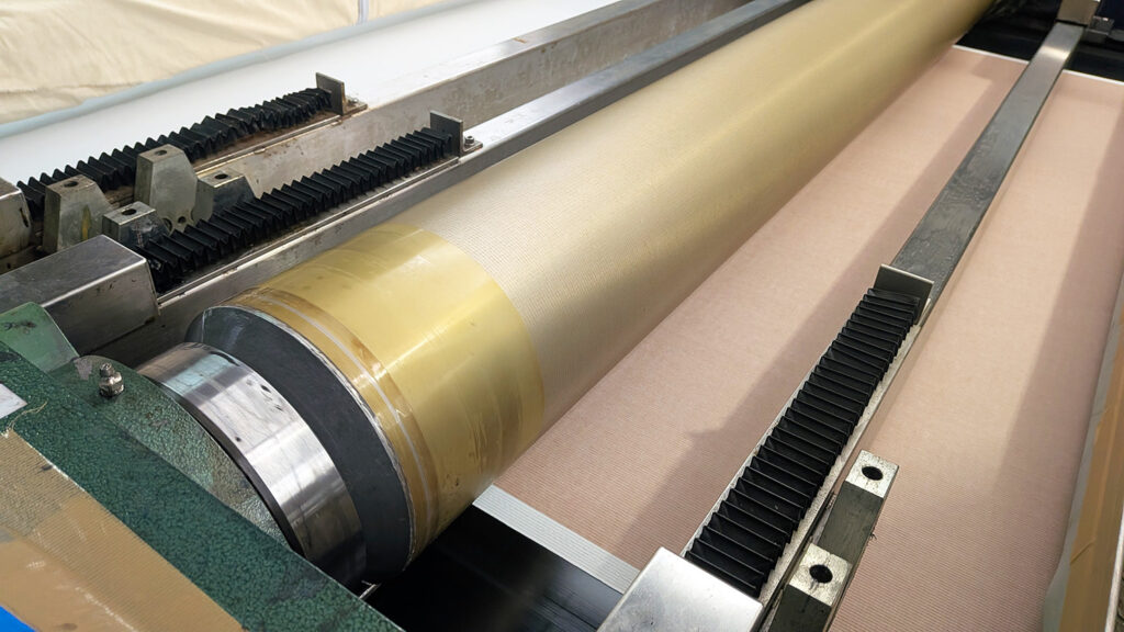 円筒形の型を回転させて、連続的に柄をプリントします。