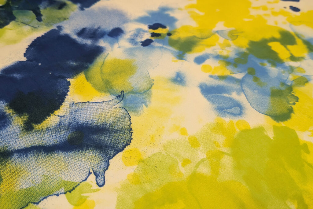 色の境界をくっきり表現するためデザインが生きる加工方法です。シャープな線からぼかしまで多彩に表現し、深みのある発色と両面鮮やかな仕上がりを量産スピードで可能にするのが特徴です。