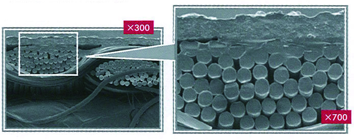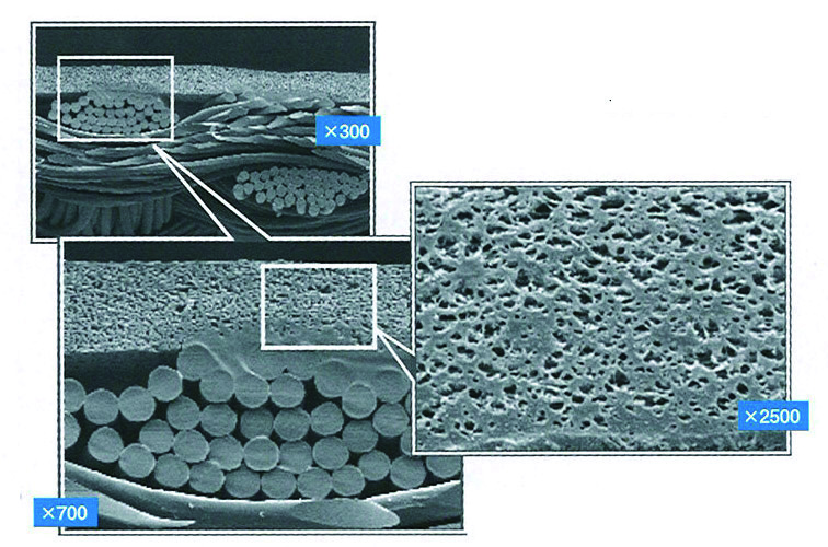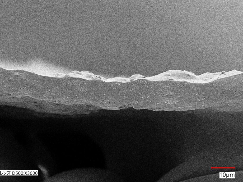 湿式技法で作られる厚み30~35μmのポリウレタン超微多孔フィルムです。そのなかには、連通した超微細にして均一な気孔(0.3~3μm)が無数(約50万個/平方インチ)に存在し、この穴を通して蒸気を逃がします。気孔が微細なるが故に耐水圧も非常に高く、蒸気透過性と防水性の相反する機能を併せ持っています。また、気孔が生み出すのは透湿防水性だけでなく、通気の役割を果たしています。気孔周辺は疎水化され、耐久性、伸縮性に優れており、着心地の良さを追求した製品です。