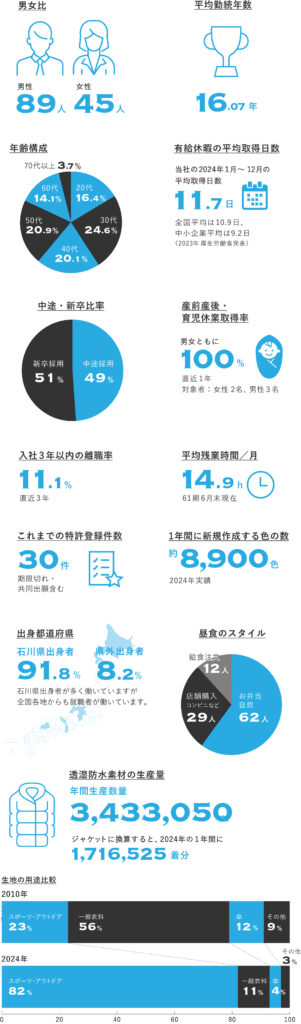 染色から高機能加工まで一貫加工できるのが当社の強みです。過酷なアウトドアにも耐えられる衣服には高い機能性が欠かせません。防水やはっ水、UVカットなど様々な付加価値を生地に与えつつ、軽さや柔軟性など風合いの良さを両立させる手法は高い評価を受けており、国内外のアウトドア・スポーツ衣料に広く採用されています。雨を通さず衣服内のムレだけを解放する透湿防水機能は、多種多様な高機能加工の中でも最も得意とする加工技術の一つです。